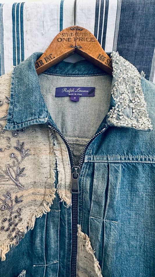 Ralph Lauren Purple Label Jacket Denim with Embellishments in Crystal, Lace & Feather