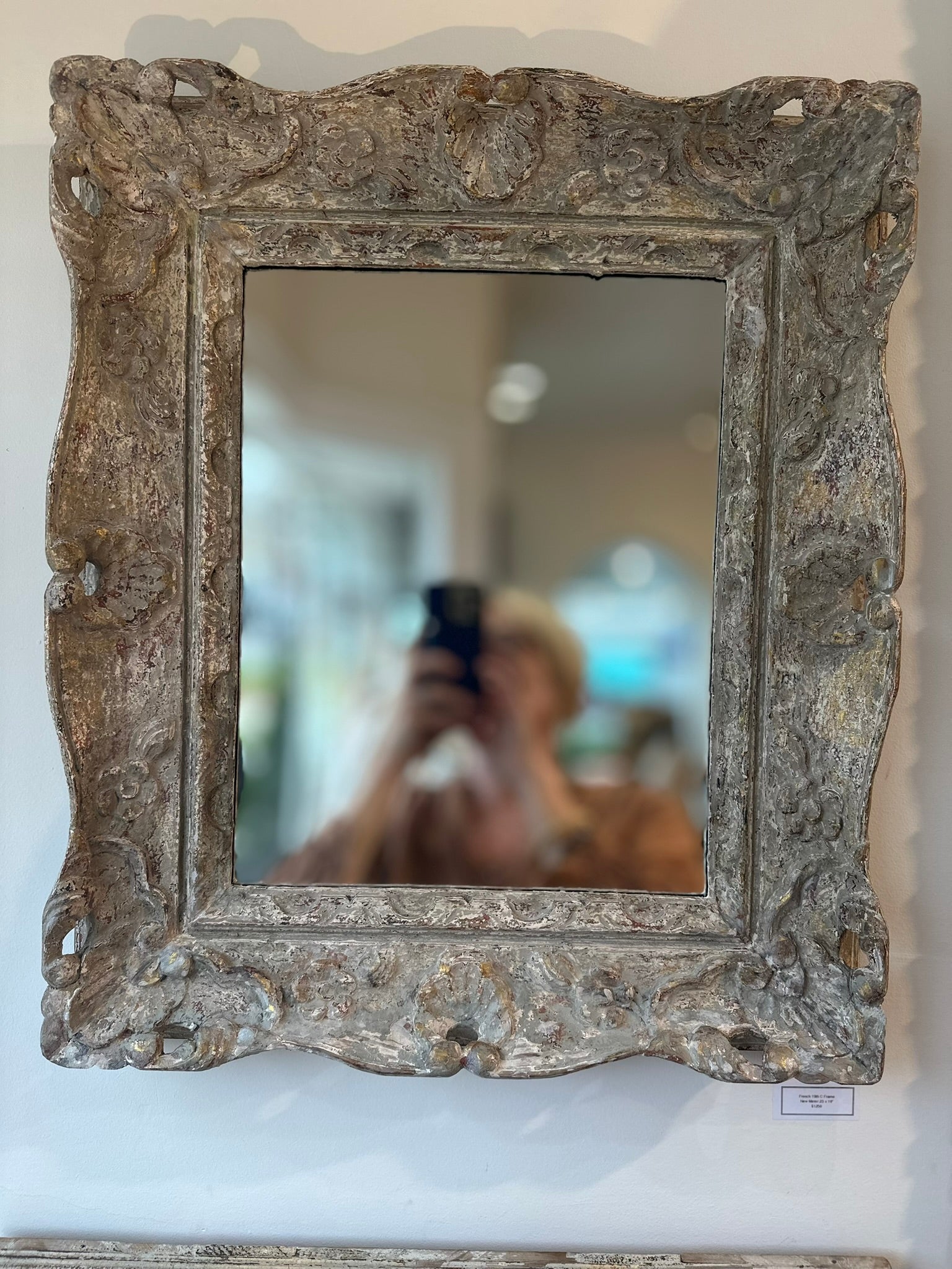 distressed finish in greys, with touches of reds and golds. could be hung either way. stunning French frame, new mirror, ready to hang.