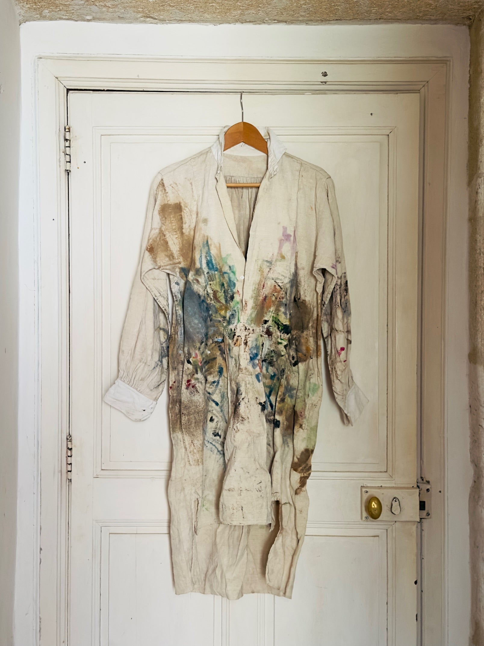 19th C French Nightshirt with paint splatter, 100% linen, with wonderful weight, makes a lovely dress, or cover up, painters smock! size s/m