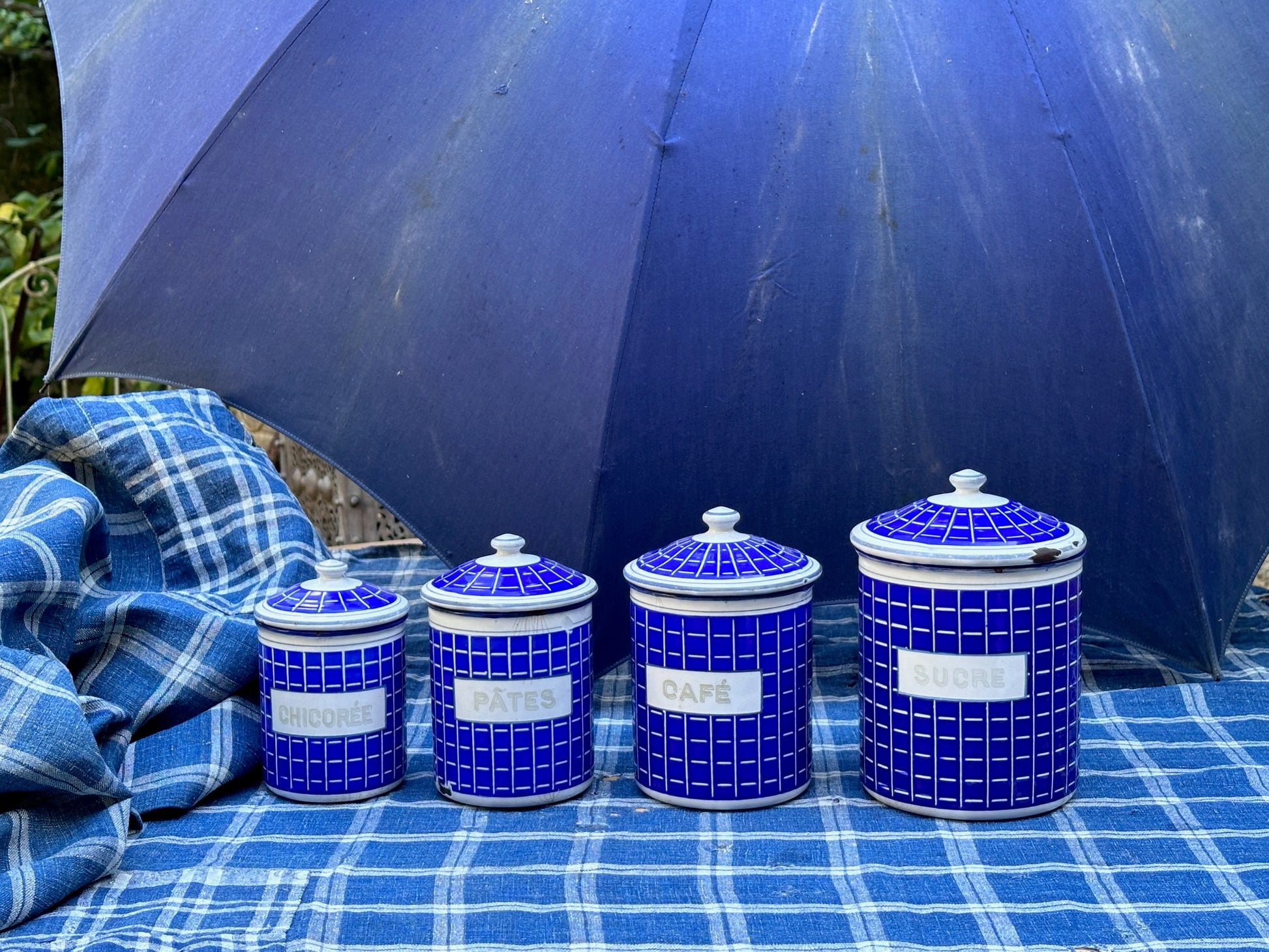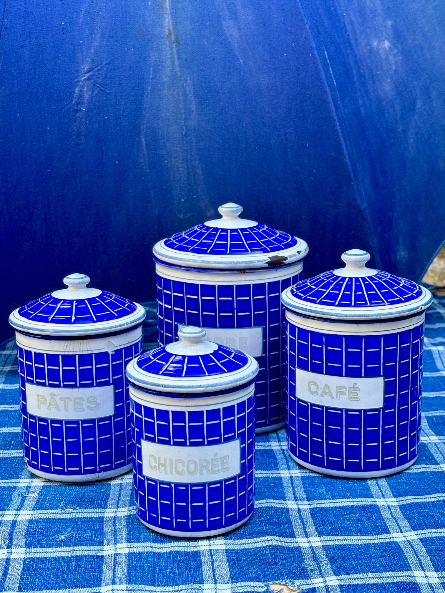 Set of 4 Bright Blue Enamel Cannisters, c 1930. French. good condition with normal wear and tear. Ready for your kitchen.