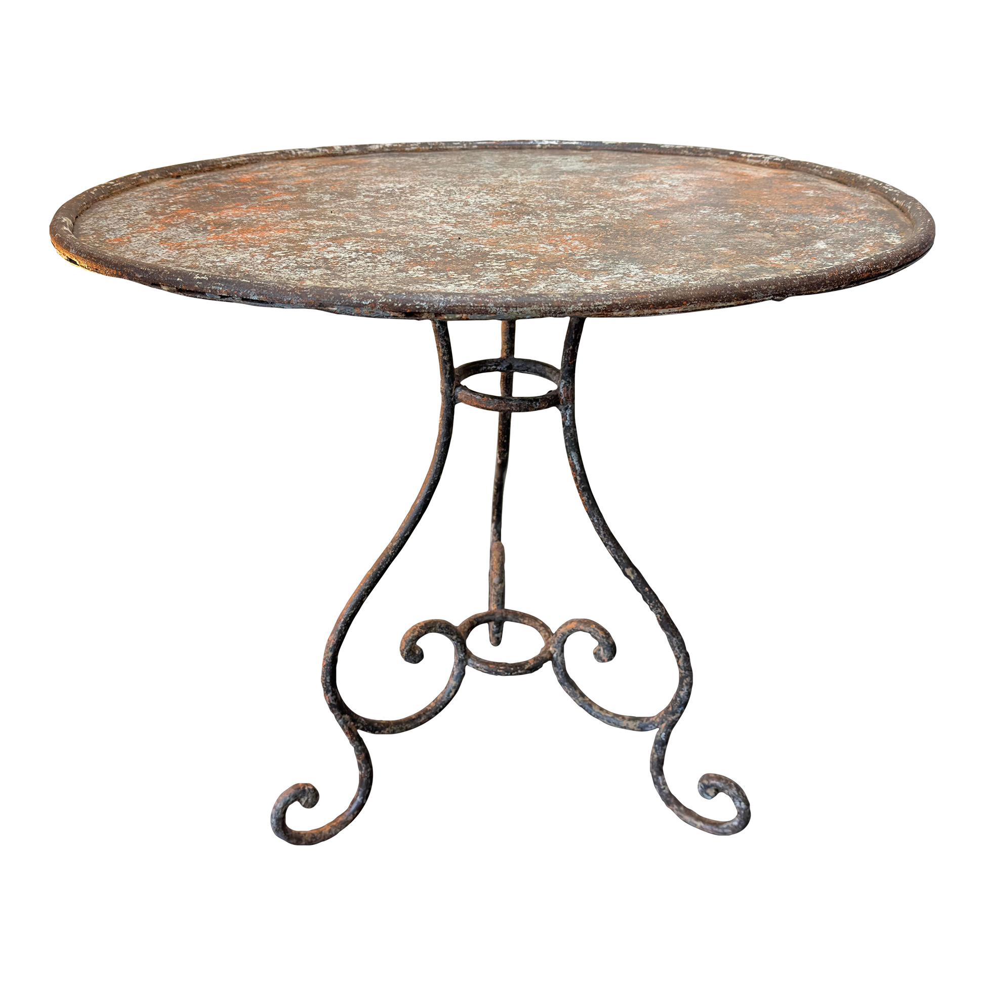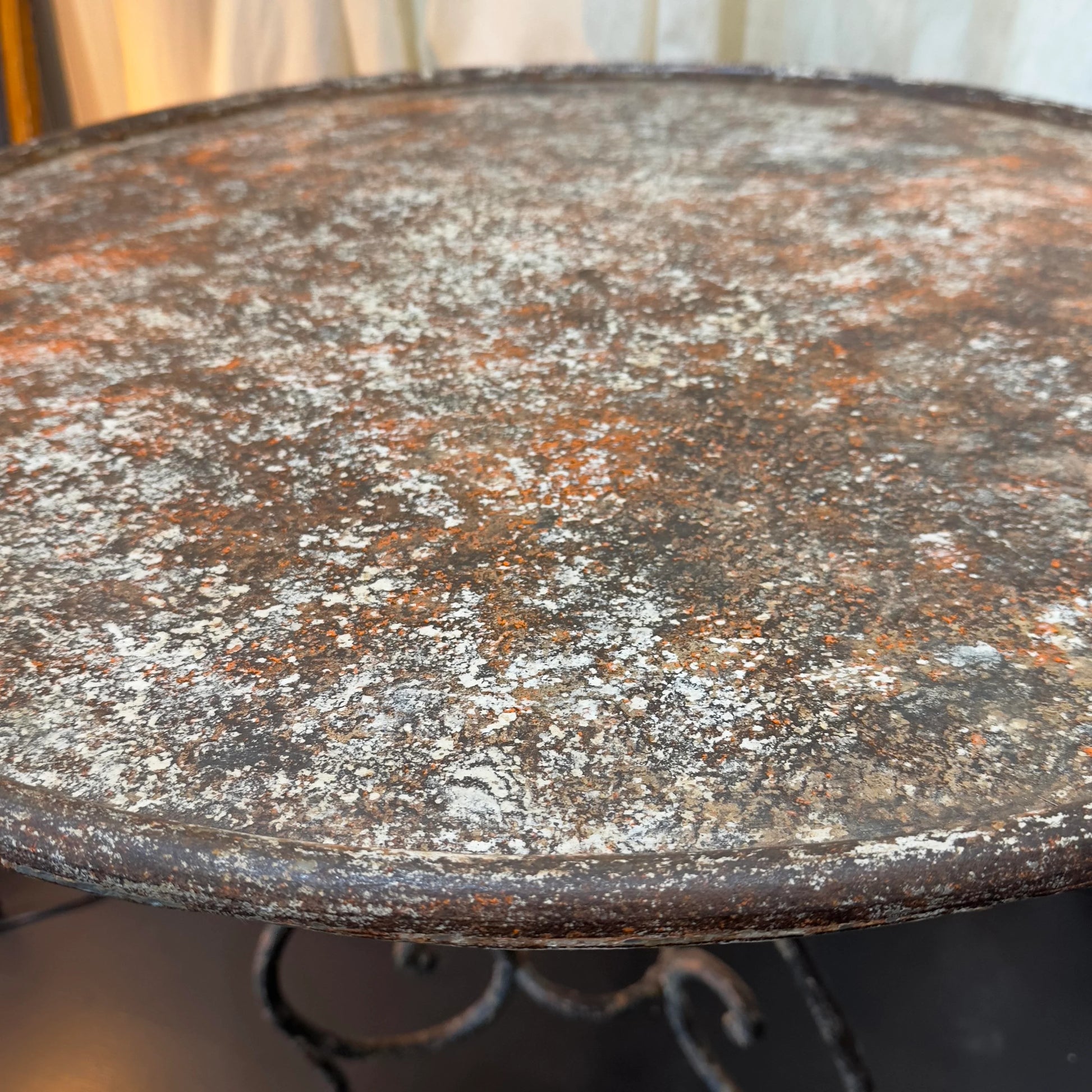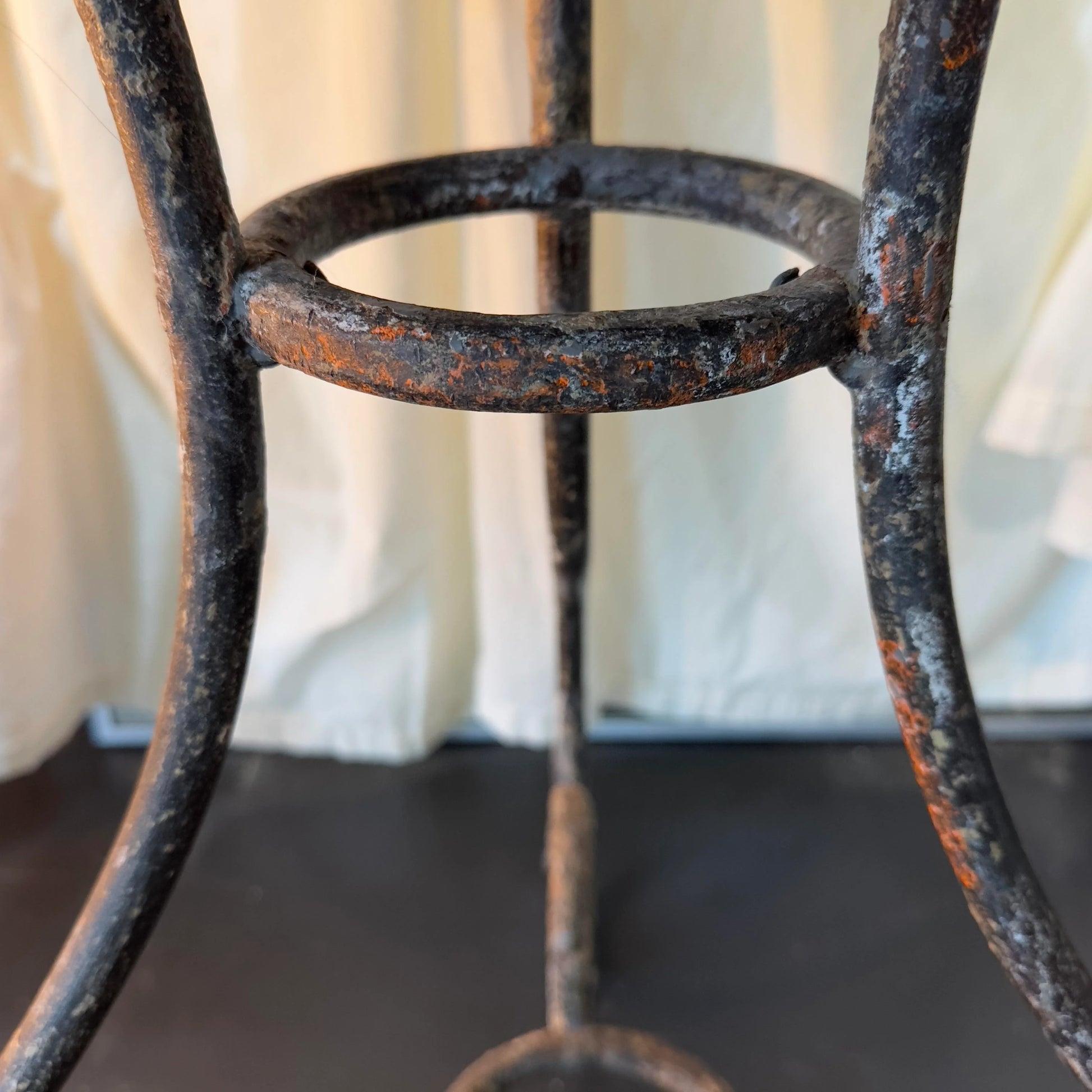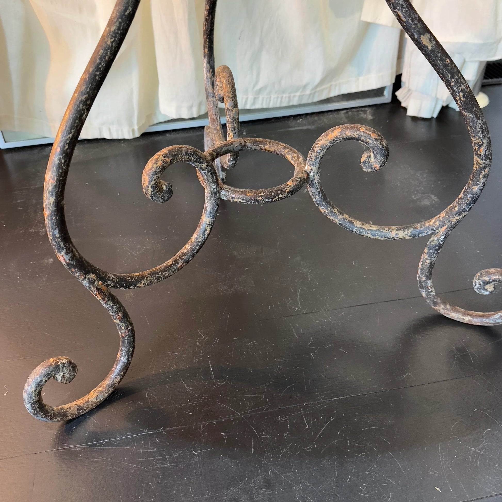 Lovely French 19th C wrought iron table, with remains of old paint. very strong and stable, could be inside or out, however if outdoors this table will need to be treated with exterior lacquer. currently finished with beeswax. Great color & patina.