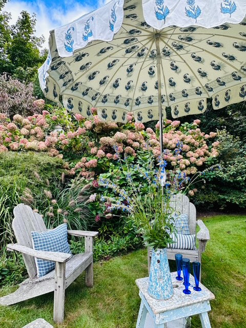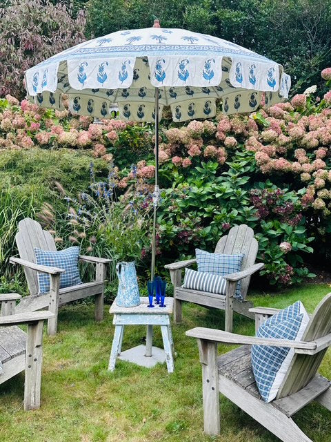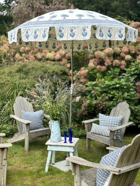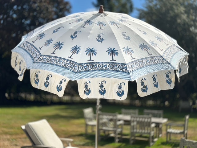 GARDEN UMBRELLAS IN BLUE AND WHITE DESIGNS, FROM INDIA