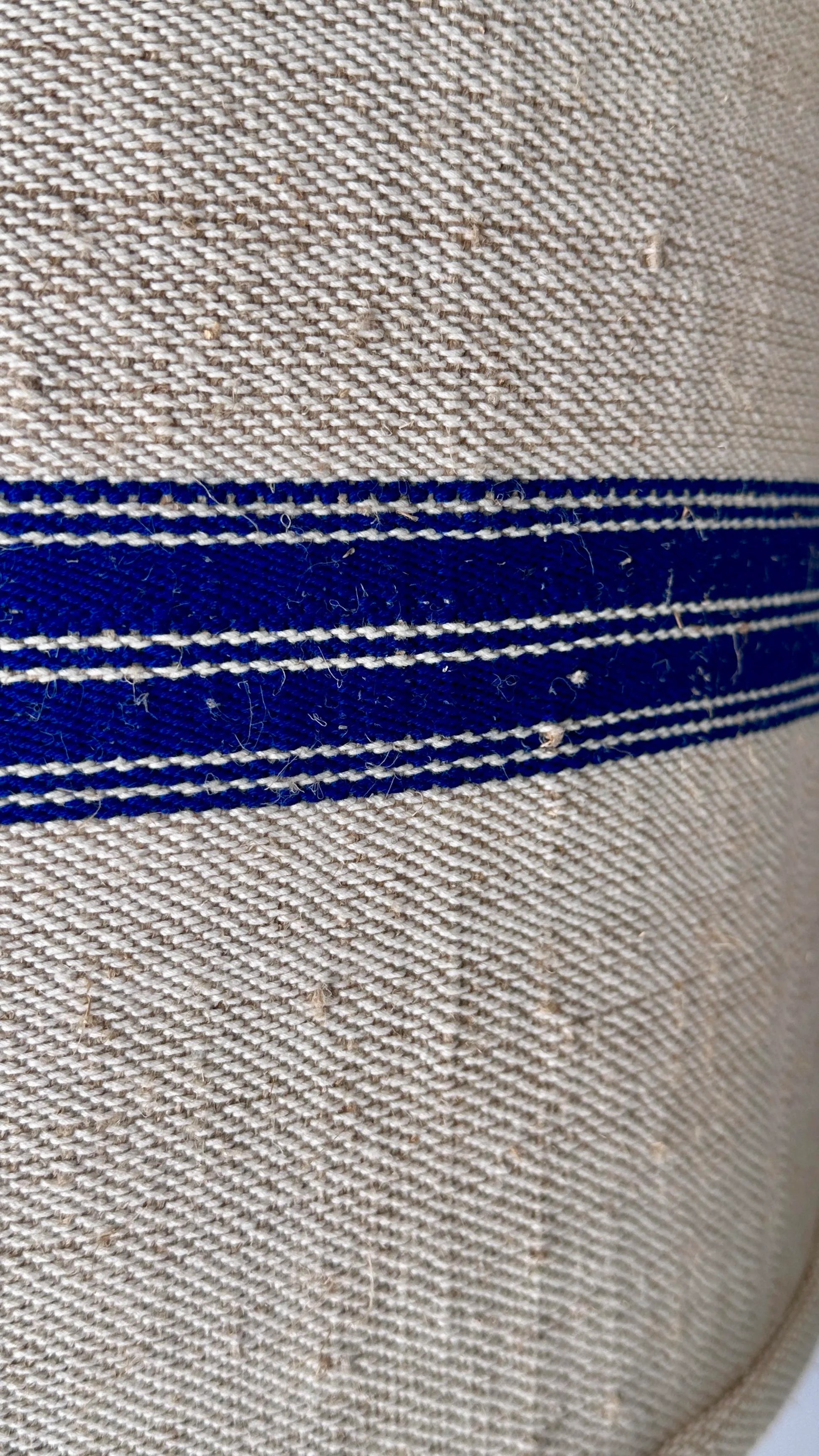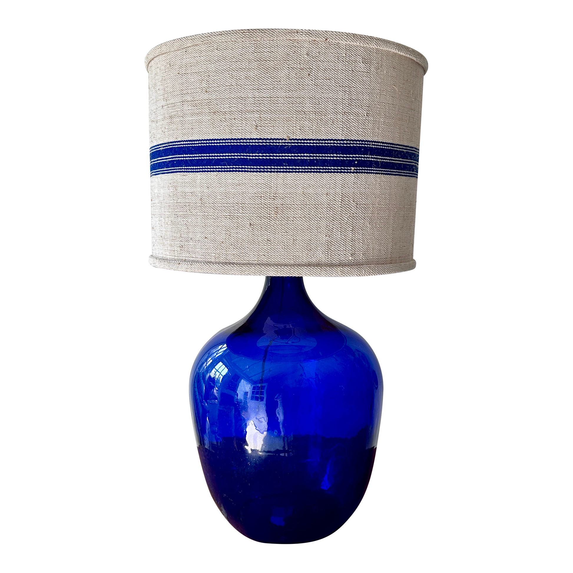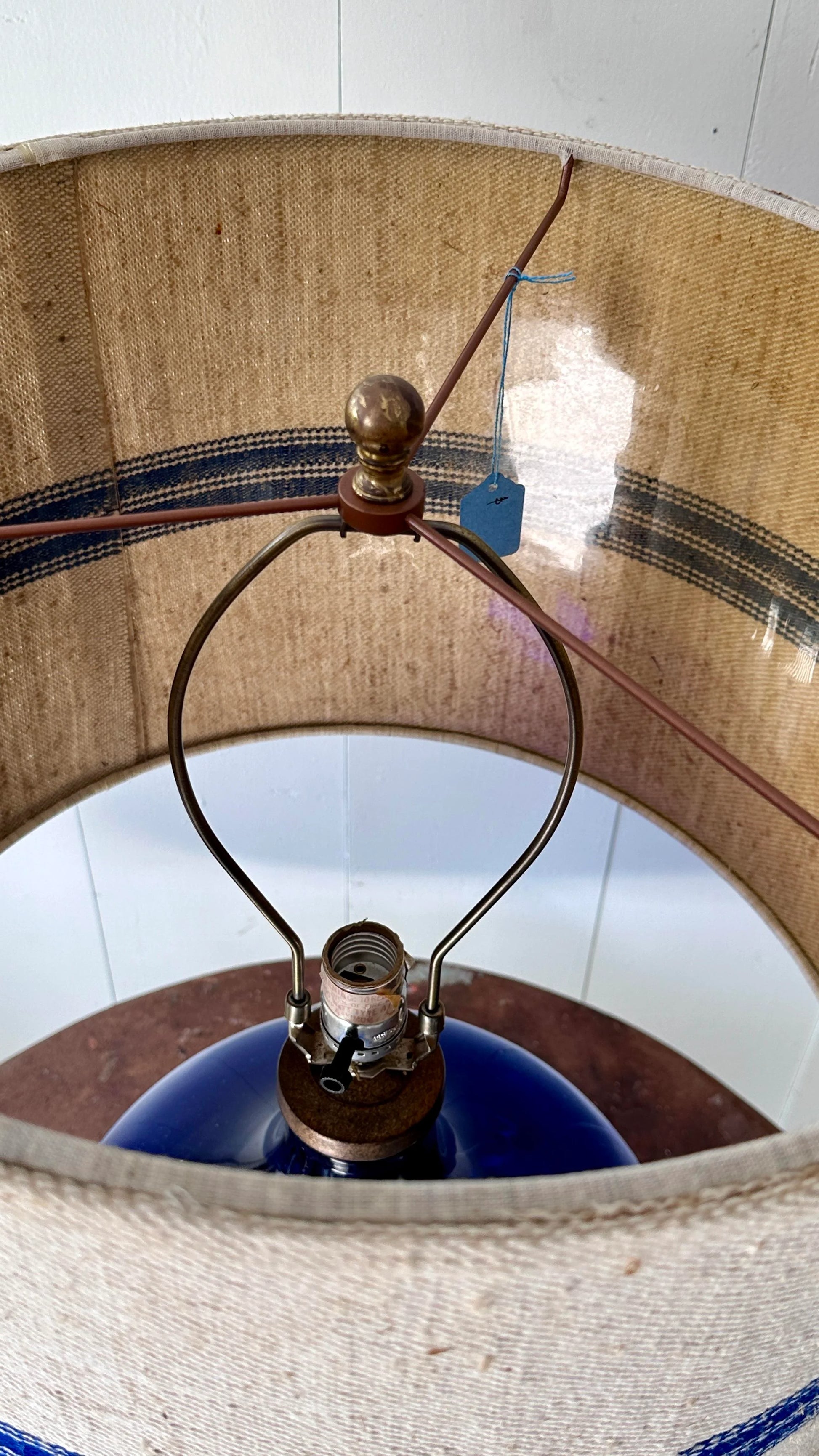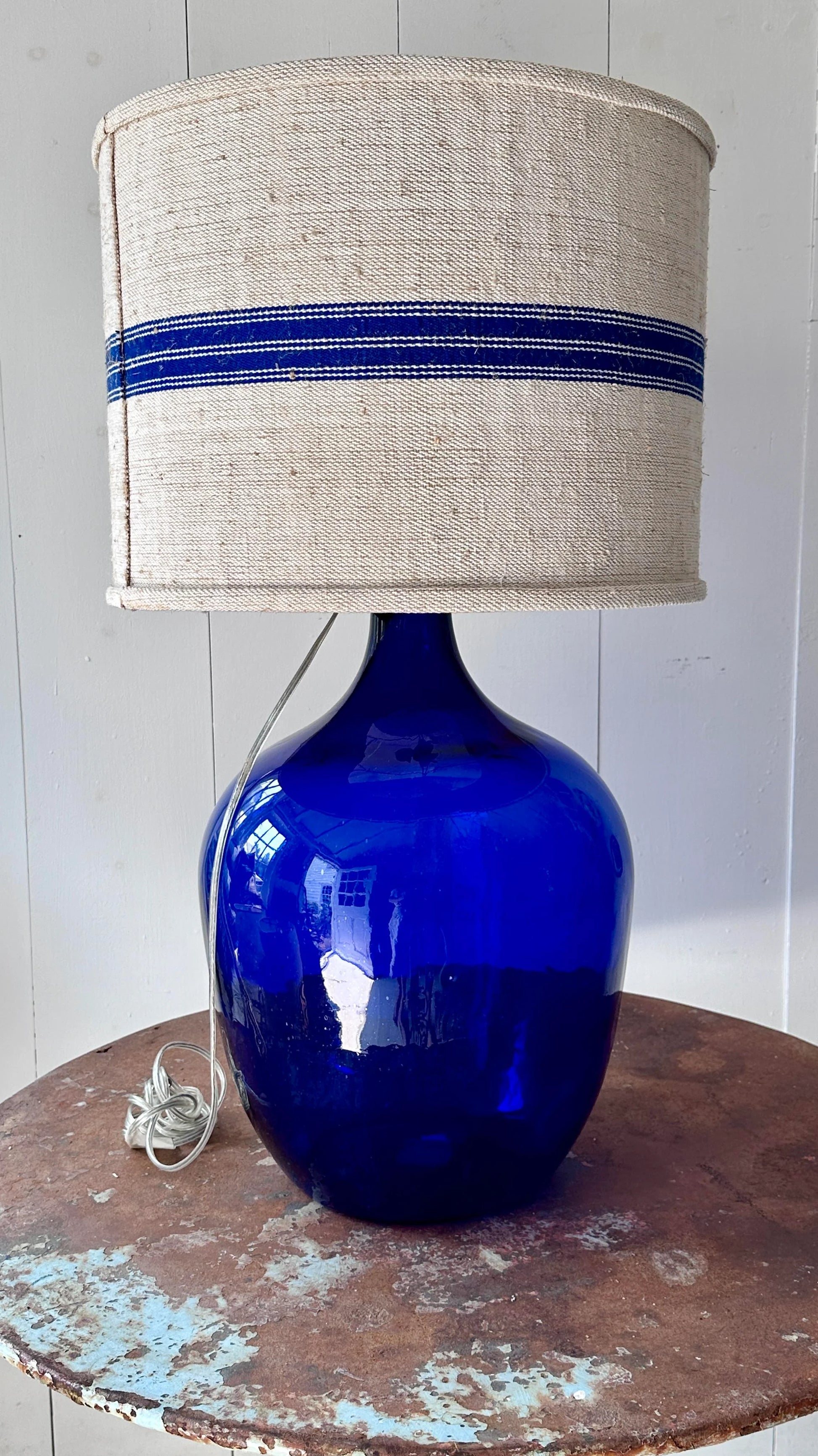 Cobalt Blue Large Old Wine Bottle converted to a table lamp, with coordinating linen shade with blue stripe. Great large size, Bottle 15-17" diamter, x 20"H