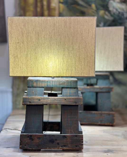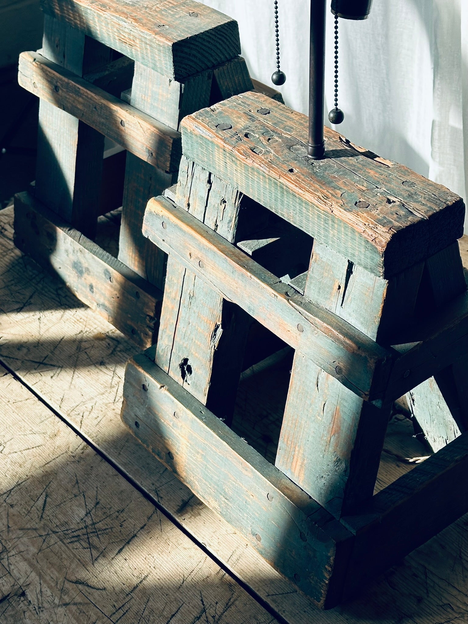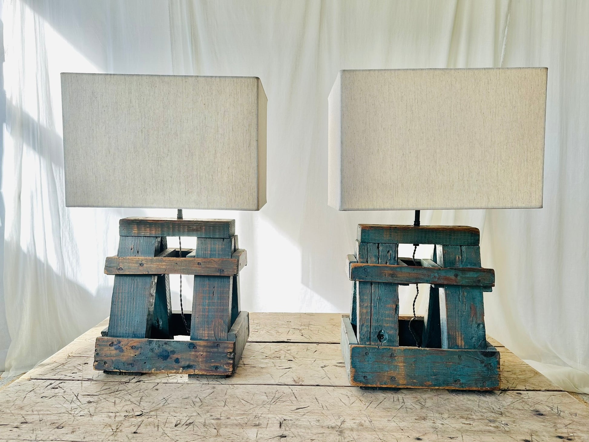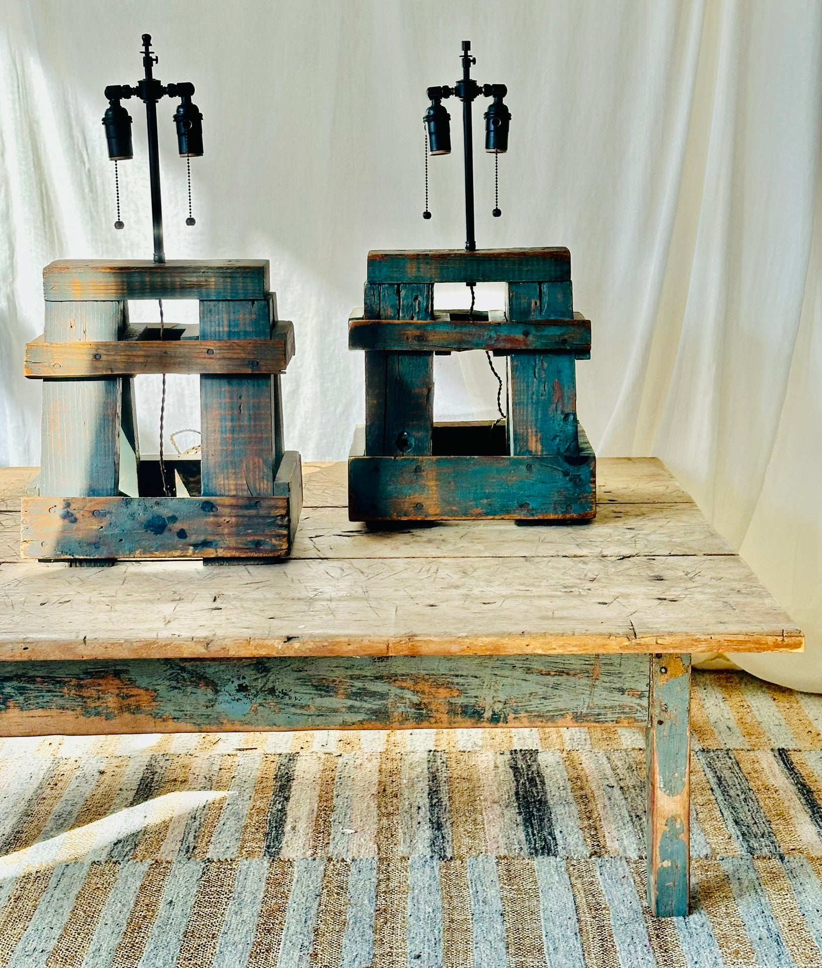 Vintage Wooden Sawhorse Lamps, in old green/blue paint, re wired and double bulb fixtures, in bronze. brown silk twisted cords.