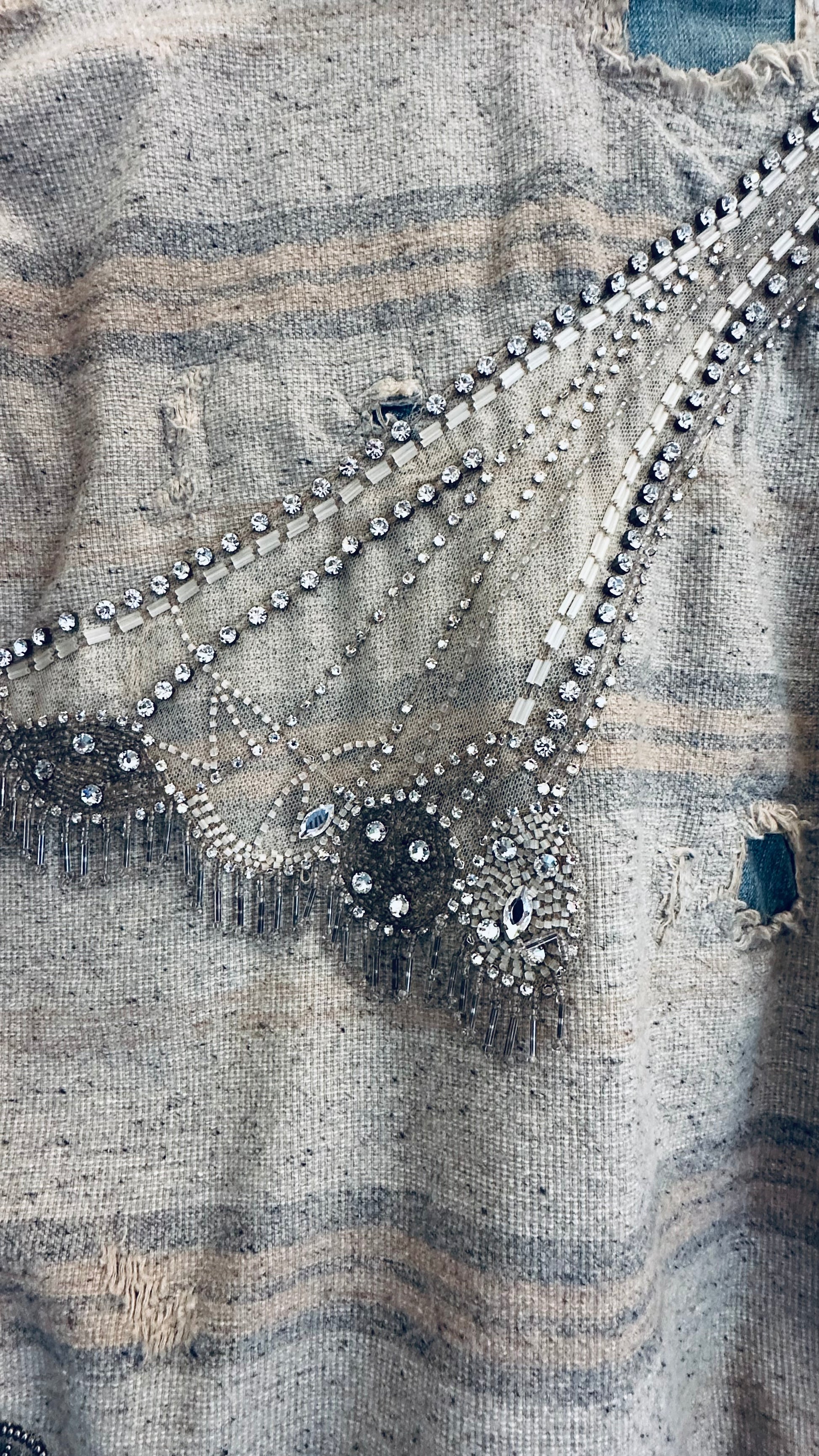 rare and limited edition RL denim jacket with vintage decoration, embellishments in crystals, lace and feathers. all original to this Italian made Jacket by Ralph Lauren.