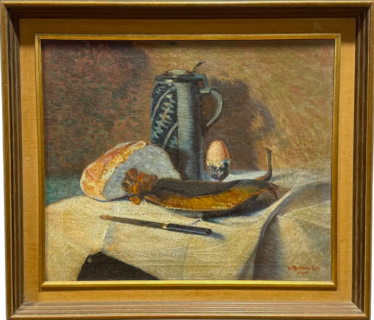 Swedish Early 20th Century Still Life of Fish, Bread and a Boiled Egg