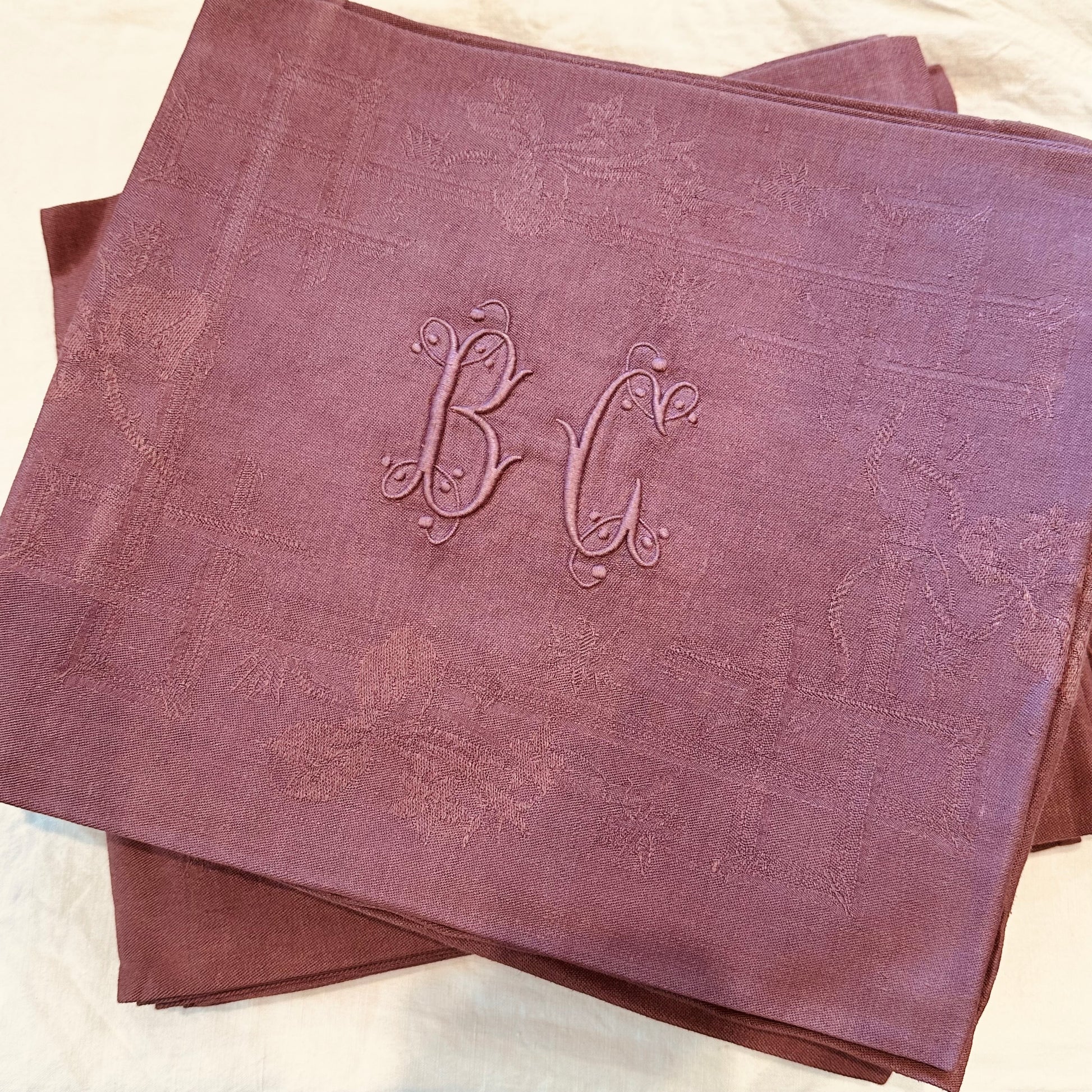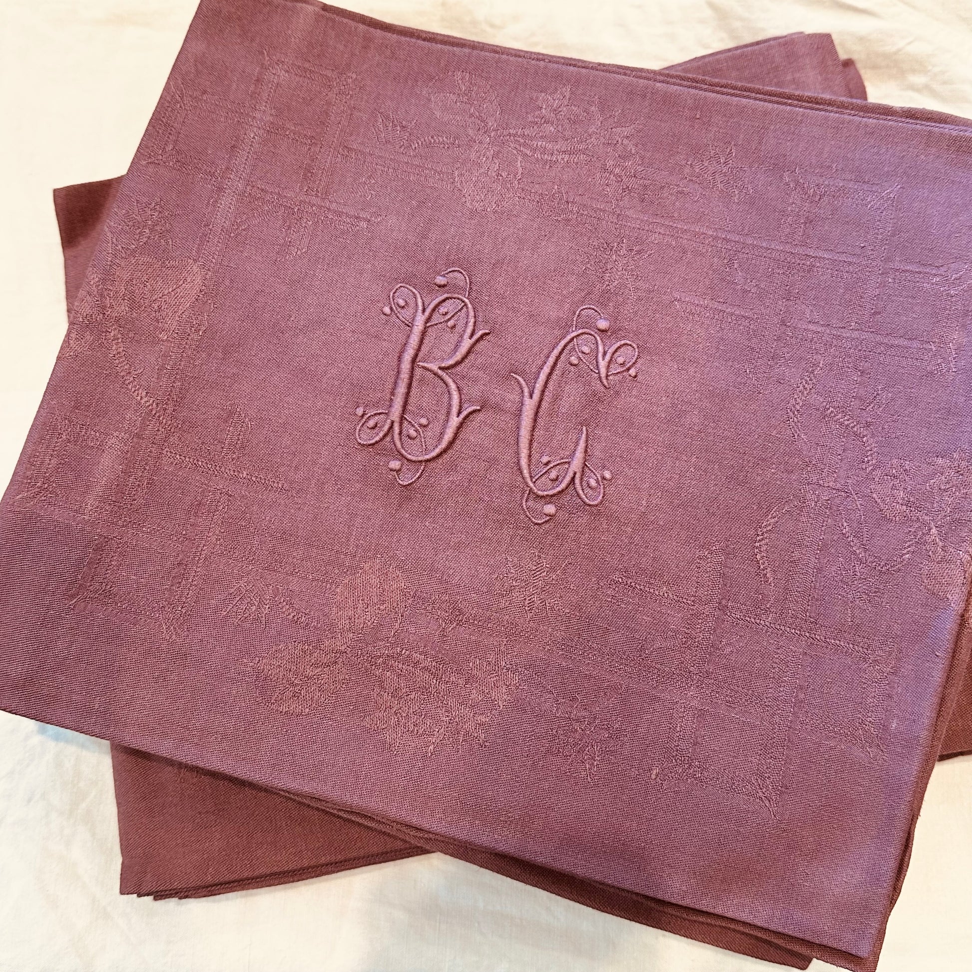 Vintage in perfect condition, French napkins almost 30 x 30”. Two sets of 6 available. Eggplant. Hand Dyed in France for me.