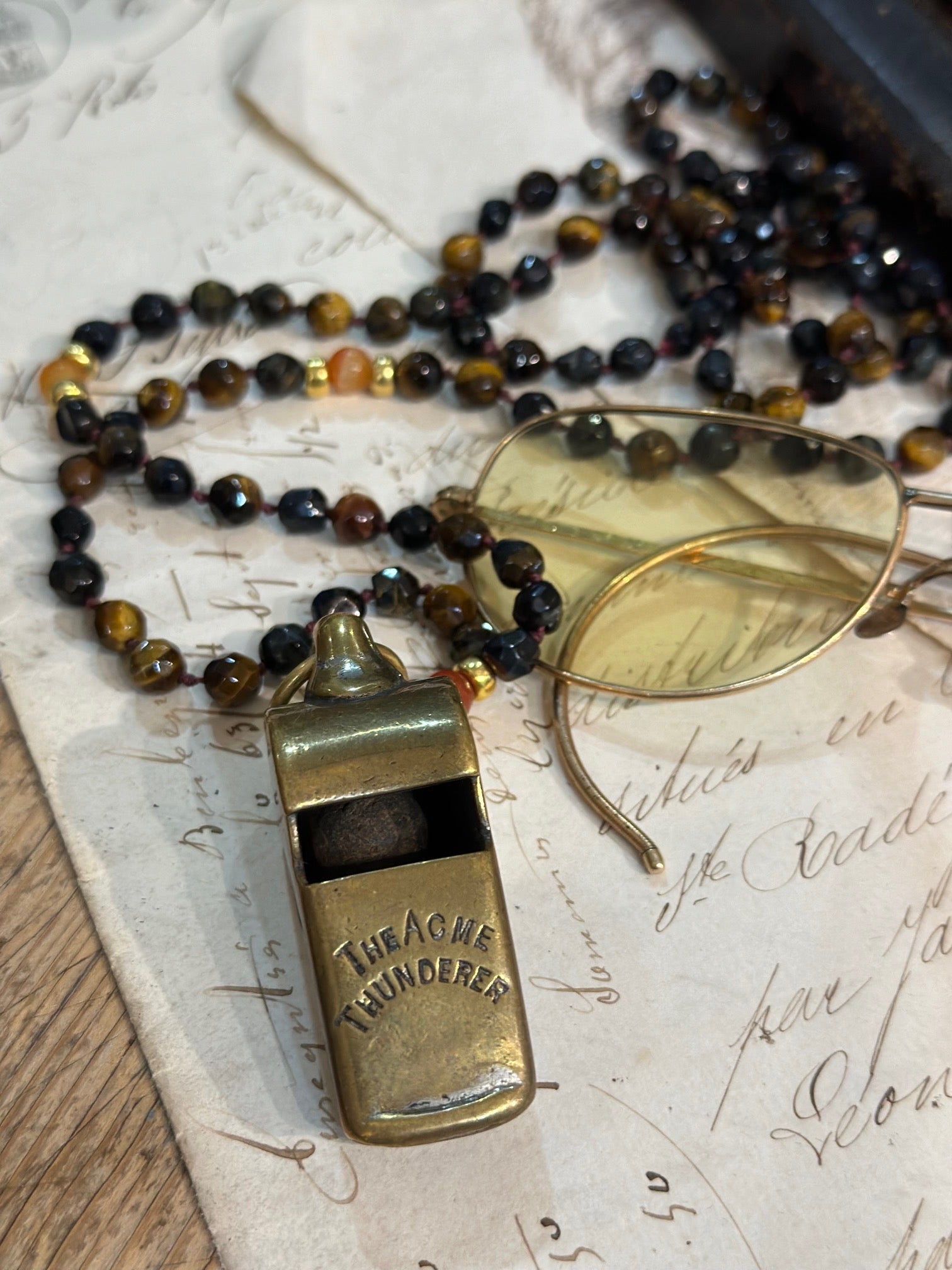 Beautiful Victorian Policeman's Whistle in brass strung on semi precious stand of gems and stones,