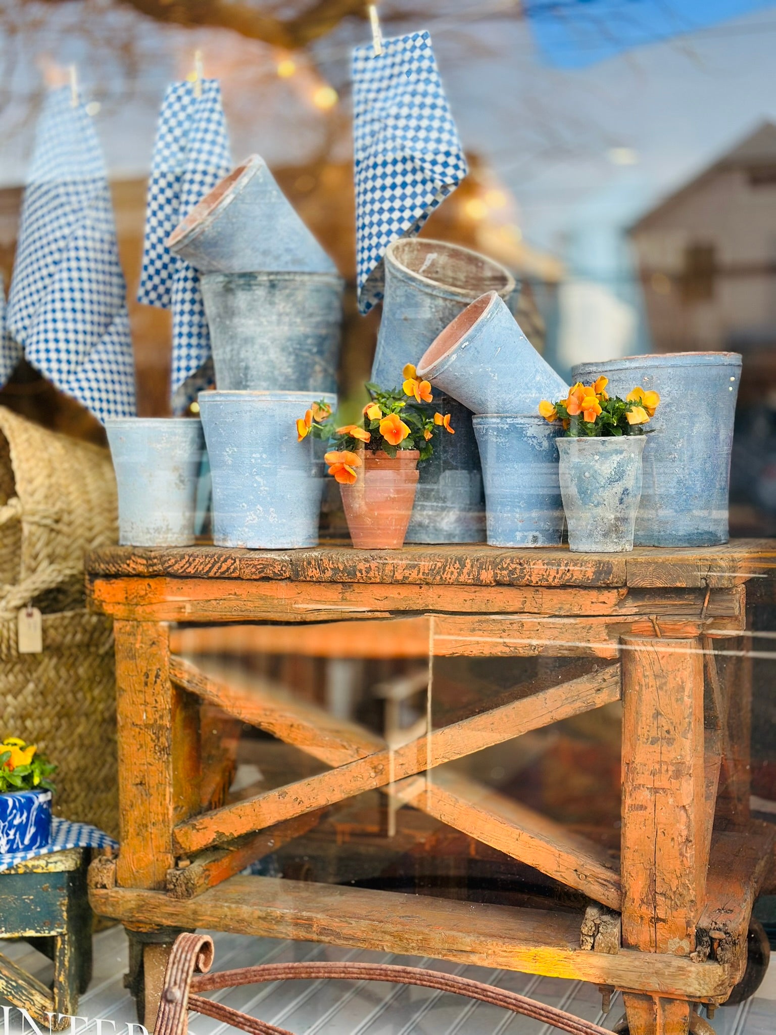 Great for display, rustic finish, very heavy, rolls on original iron wheels, make a good side table too.